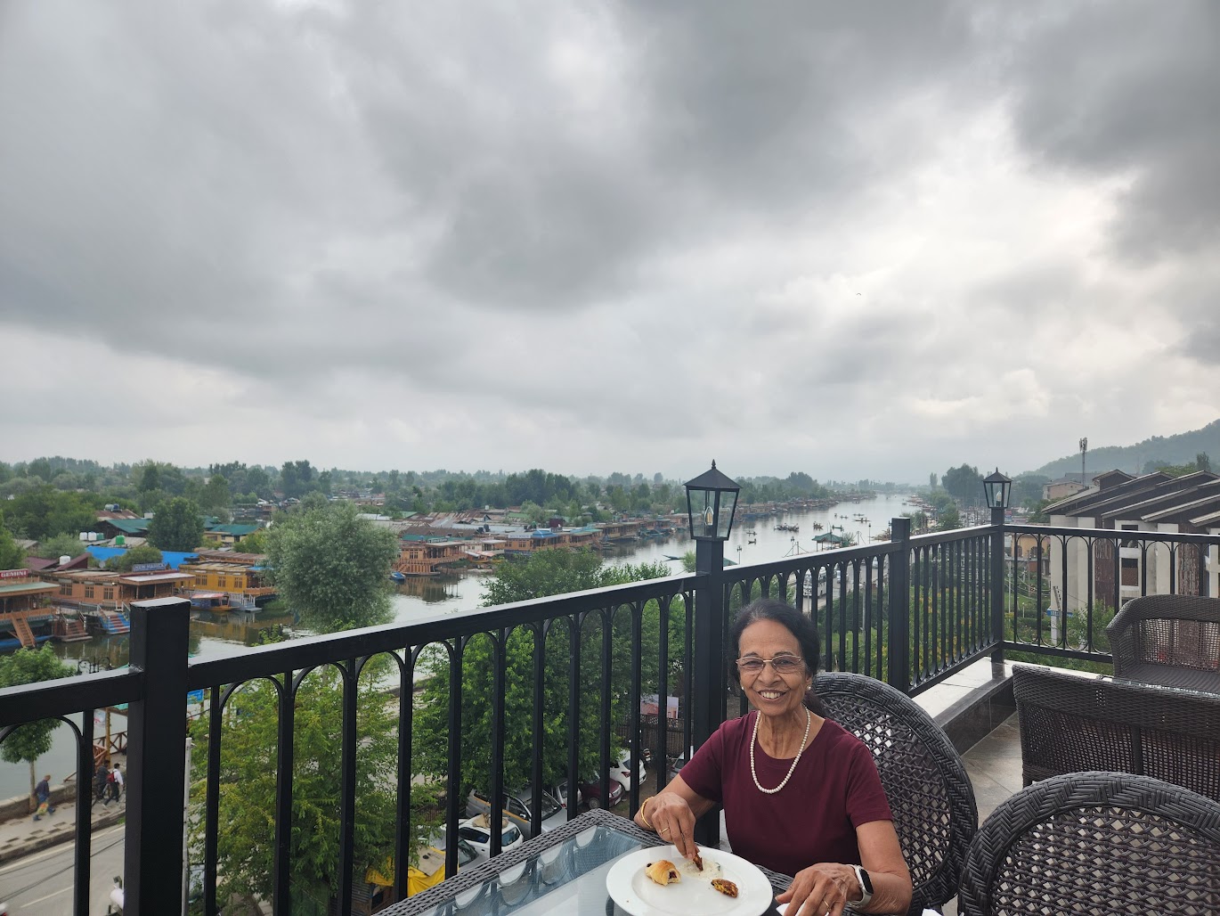 After the long drive from Gurez, we reached Srinagar late evening, checked-in into The Vintage, a decent property wherein our room had a lovely view of the Dal Lake. We enjoyed these views with a nice dinner in our room itself. We had a good night’s sleep and were fresh in the morning, ready to explore Srinagar! However, it was a rainy morning, so our venturing out got a little delayed. We decided to enjoy a leisurely buffet breakfast at the hotel’s rooftop restaurant, that offered great views of the Dal lake and the city. As the rain subsided, we started our day by a visit to the Shankaracharya Temple, apparently the oldest Hindu temple of Kashmir. Perched on a hilltop, the drive up to the car parking area was nice and green. Post that, one needs to climb about 250 steep stairs to reach this Shiv temple and it offers a bird’s eye view of the Srinagar city. It was cloudy and the mist added to the splendid views. The Jhelum looked stunning and the multiple bridges over the river reminded me of Paris!